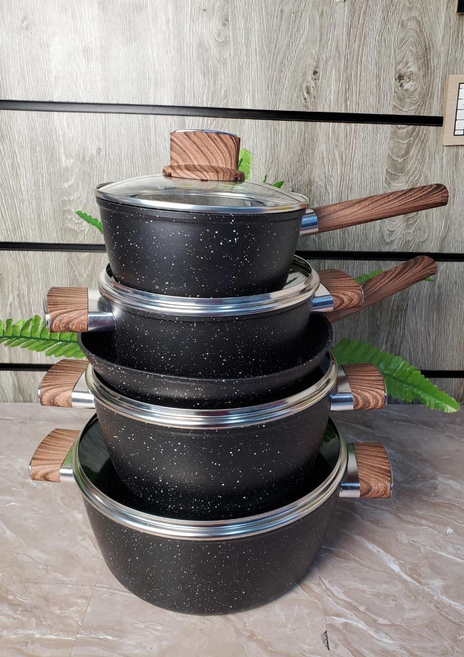 Has 28cm casserole with a lid ,24cm casserole with a lid ,20cm casserole with a lid ,18cm sauce pan with a lid ,24cm frying pan