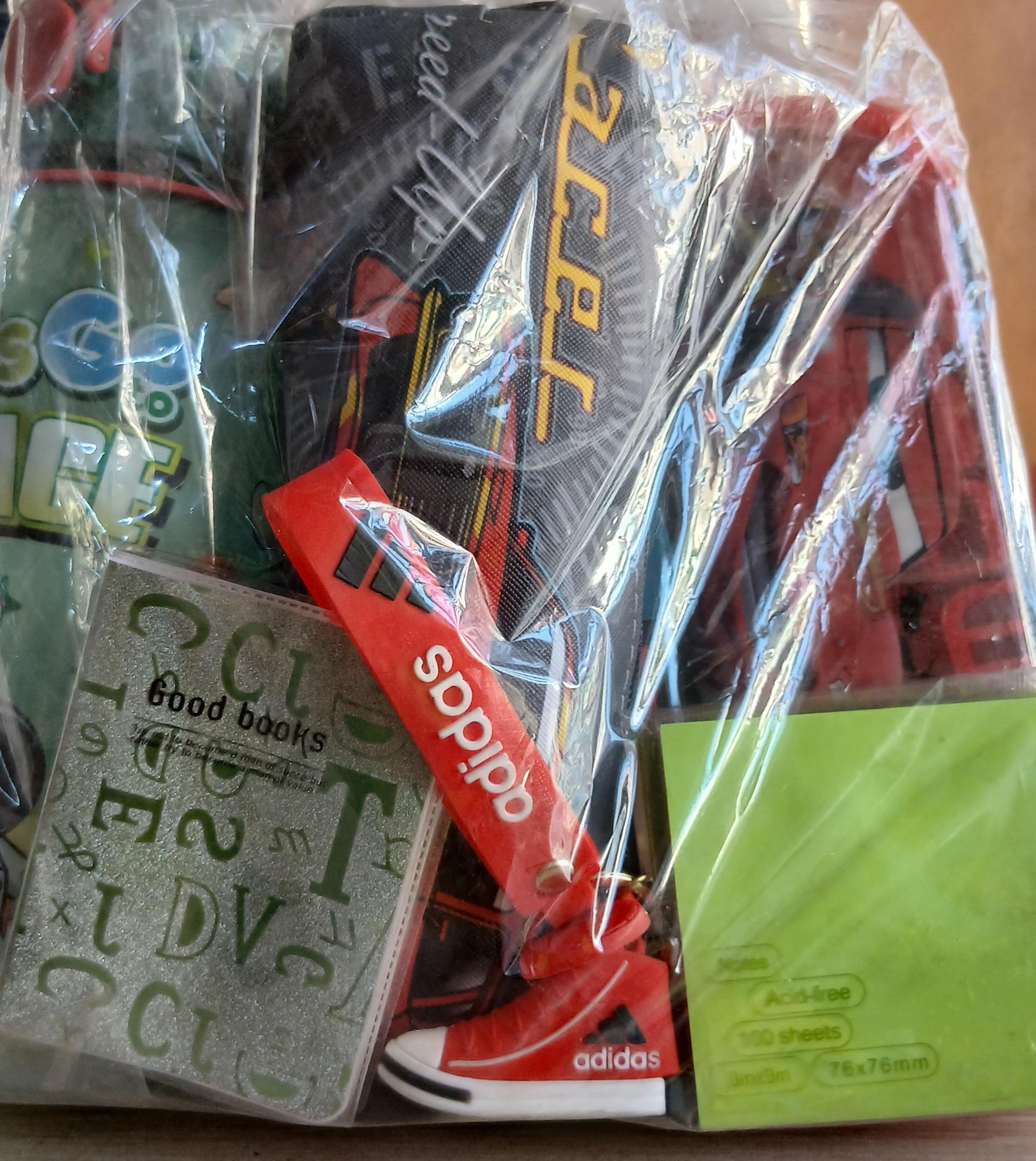 Water bottle💦,Pencil pouch✏️,Pencil case🖊,small notebook📚,adidas 🔑keyholder,multicolured sticky notes📝